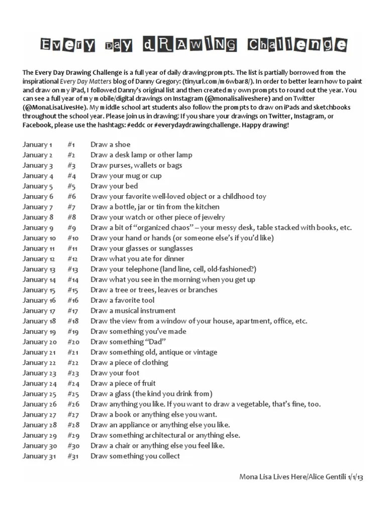 November Every Day Drawing Challenge Task List Mona Lisa Lives Here from monalisaliveshere.files.wordpress.com This is why we created the 365 challenge. 365 pages of drawing prompts to inspire artists, and incite the imagination, 365 pages of . Sketchbook with animal drawing ideas, a yearly drawing challenge, 365 sketch prompts (drawing books, . I have made a list of objects you should already have around the house or in your community. With the 365 challenge, we encourage artists to create art every day regardless of skill level. There's a new word each day for a total of 365 word . Small 365 day blank creative notebook : Let the drawing continue with no breaks.